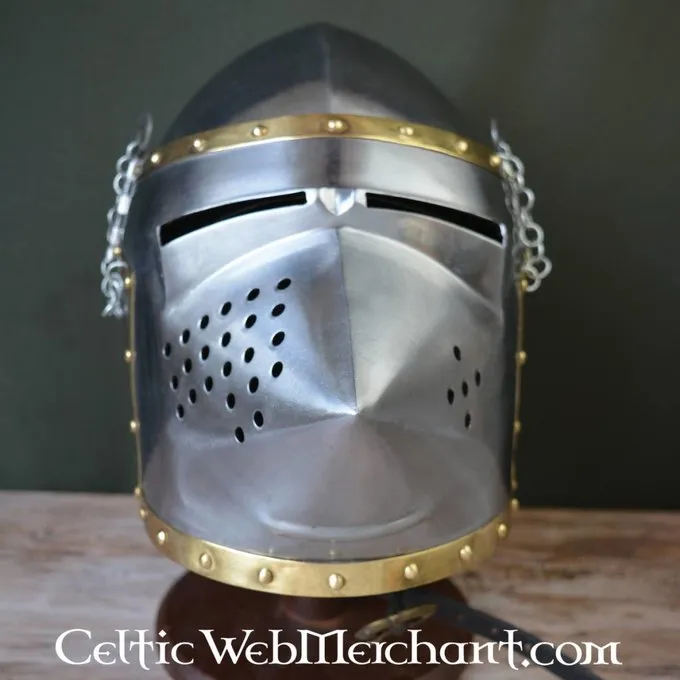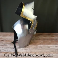 Deze hondensnuit bascinet heeft een gepunt vizier om slagen tegen het gezicht te gelijden. Het vizier is voorzien van luchtgaten en biedt een goed gezichtsveld. De helm is net als het origineel gedecoreerd met messingen beslag.De helm is geschikt voor hoofden met een maximale omtrek van 61 cm.