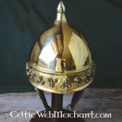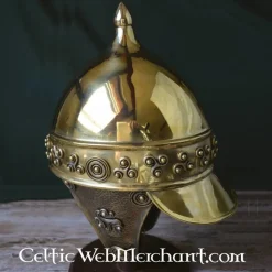 Deze Gallische helm is een gedetailleerde replica van een origineel uit de La Tèneperiode. Helmen zoals deze werden in vergelijkbare stijlen overal in de Keltische wereld gedragen. De helm is gedecoreerd met verschillende Keltische trisqelion en spiraalmotieven die kenmerkend zijn voor de La Tèneperiode.