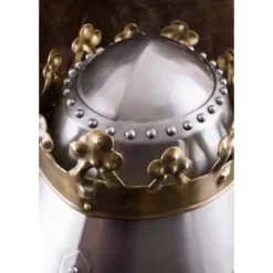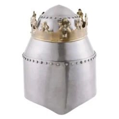 De zogenaamde grote helm, ook wel bekend als een pothelm of heaume, werd vaak gedragen over een kleinere, lichtere helm. Het was in de middeleeuwen wijdverspreid in heel Centraal-Europa en dit model is gemaakt naar afbeeldingen, miniaturen en vondsten uit Duitsland, Vlaanderen, Engeland, Italië, Zwitserland, Oostenrijk, enz. Deze helmen verschenen ten tijde van de kruistochten in de late 12e / vroege 13e eeuw en werden tot ver in de 14e eeuw door de ridders gebruikt. Om op te vallen en hun status te benadrukken, droegen koningen vaak een pothelm met een kroon op het slagveld. Op deze manier konden ze gemakkelijker worden herkend door hun eigen soldaten in de strijd en kregen ze speciale bescherming. Mogelijk bood de kroon de koning ook de kans om gegijzeld en vastgehouden te worden voor losgeld in plaats van onmiddellijk door de tegenstander te worden gedood. Deze middeleeuwse helm replica is gemaakt van 1,6 mm (16 gauge) staal en versierd met een geklonken koperen kroon. De afzonderlijke delen zijn allemaal met elkaar verbonden door stalen klinknagels. De vizierspleten zijn elk ca. 13 cm lang, 0,5 tot 1 cm breed en de vele ronde uitsparingen aan de rechterzijde zorgen voor de nodige luchtcirculatie. De gezwarte binnenkant is voorzien van een leren inleg, en de verstelbare kinband van bruin 3 mm dik leer is voorzien van een messing gesp (met antiek finish). Deze helm is perfect voor middeleeuws reenactment, nobele kostuums en voor helmverzamelaars.