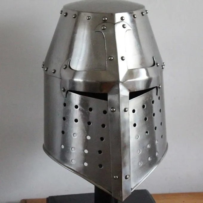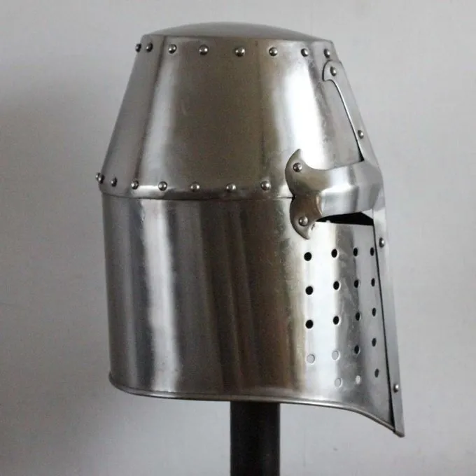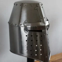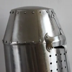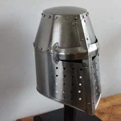 Deze replica is gebaseerd op verschillende originele helmen uit de 13de eeuw. De grote helm of pothelm ontstond in de 12de eeuw in verband met de kruistochten en bleef tot in de 14de eeuw in gebruik door zowel ridders als zware infanterie in heel Europa. In deze eeuwen veranderde hij van een simpel ontwerp met alleen kleine spleetjes voor ogen en mond naar een afgeronde helm. De grote helm gaf meer bescherming dan de vroegere neushelm, maar verkleinde het gezichtsveld en had geen goede ventilatie, dus over het algemeen werd hij pas vlak voor het gevecht opgedaan. Onder de grote helm werd vaak een kleinere helm gedragen als de secret of de bascinet.