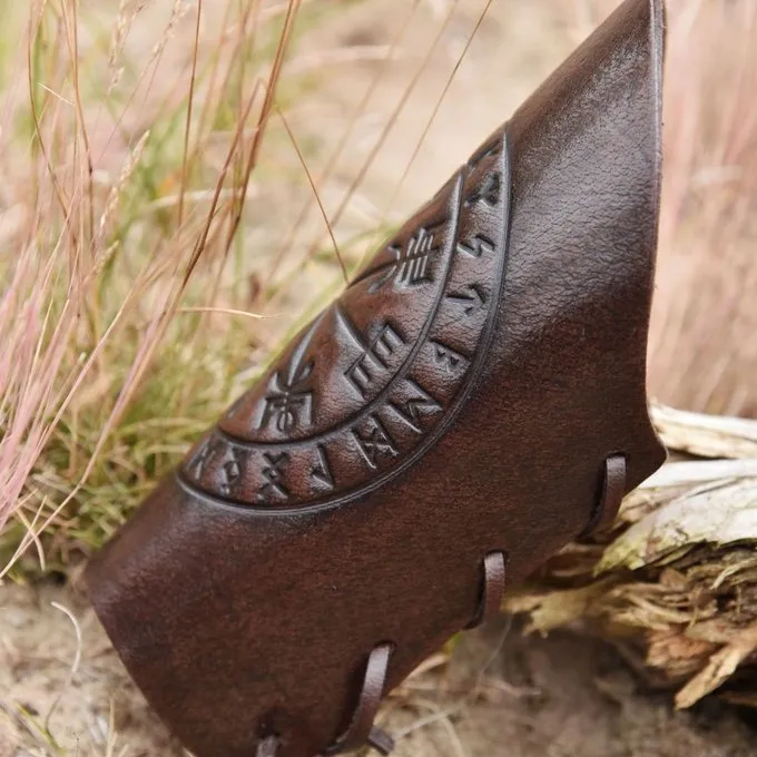 Deze armbeschermer is prachtig gedecoreerd met een Vegvisir motief. De Vegvisir is een symbool uit het IJslandse Huld manuscript, een 19de eeuws occult boek met spreuken. Vegvisir betekent: dat wat de weg laat zien. Wie dit magische symbool droeg zou niet verdwalen tijdens storm. Het is niet bekend of de vroegmiddeleeuwse Vikingen dit symbool kenden. Maar in de moderne Vikingcultuur en bij neopaganisten speelt het een belangrijke rol en heeft het een nieuwe context gekregen. Deze armbeschermer is prachtig bij een Viking kostuum.