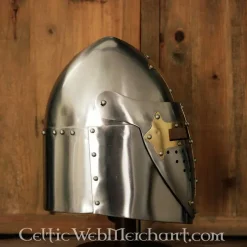 In de middeleeuwen werden helmen met een conische vorm sugarloaf helmen genoemd omdat de vorm aan een suikerbrood deed denken.Ze waren vooral populair in dde 14de eeuw. Deze helm onderscheidt zich door het scharnierende vizier. Hij is met de hand gemaakt uit 1,6 mm dik staal. De helm kan met zijn linnen inleg gemakkelijk op maat worden aangepast. Verder is de helm voorzien van een kinriem. De helm is geschikt voor een hoofdomtrek van ca. 61 cm. Van oor tot oor is de afmeting ca. 19 cm en gemeten vanaf de helft van het achterhoofd tot helft voorhoofd 22,5 cm. Het gewicht is ongeveer 2,9 kg.