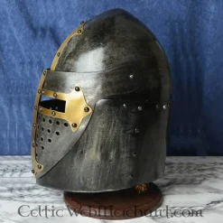In de middeleeuwen werden helmen met een conische vorm sugarloaf helmen genoemd omdat de vorm aan een suikerbrood deed denken.Ze waren vooral populair in dde 14de eeuw. Deze helm onderscheidt zich door het scharnierende vizier.Hij is met de hand gemaakt uit 1,6 mm dik staal. De helm kan met zijn linnen inleg gemakkelijk op maat worden aangepast. Verder is de helm voorzien van een kinriem. De helm is geschikt voor een hoofdomtrek van ca. 61 cm. Van oor tot oor is de afmeting ca. 19 cm en gemeten vanaf de helft van het achterhoofd tot helft voorhoofd 22,5 cm. Het gewicht is ongeveer 2,9 kg.