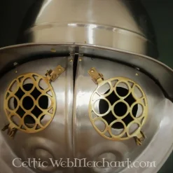 Deze gladiatorenhelm is een replica van een origineel uit de 1ste eeuw n.Chr teruggevonden in Pompeii. De helm is gemaakt van koolstofstaal met een staaldikte van 1,2 mm. De Thraex wordt regelmatig op Romeins aardewerk, glaswerk en op frescos afgebeeld.