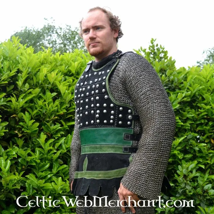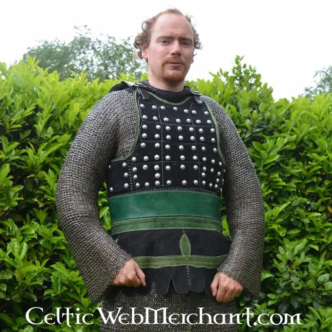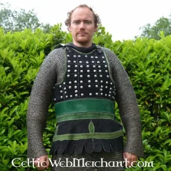 Deze brigandine is gemaakt van 1,3 mm dik zwart rundleer.