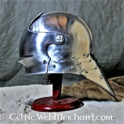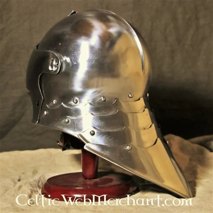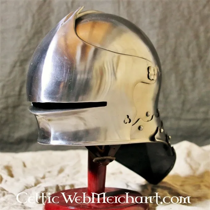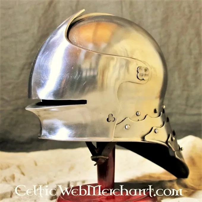 Deze sallet is een replica van een Duits origineel dat dateert uit 1490. De sallet werd waarschijnlijk in Frankrijk en Engeland half 14de eeuw ontwikkeld. Echter werd hij nergens zo intensief gemaakt, en lang gebruikt als in de gebieden van Duitsland. Deze praktische helm was zowel populair bij de aristocratie als bij de gewone soldaat. Ze werden vaak snel in massa geproduceerd, de meeste sallets waren dan ook niet mooi afgewerkt, of hadden geen opklapbaar vizier of nekbeschermers zoals deze. Deze luxe sallet is voorzien van een flexibele nekbeschermer en een opklapbaar vizier. Hij kan gemakkelijk in combinatie met een bevor worden gedragen.