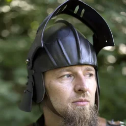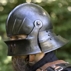 Deze sallet is gebaseerd op 16de eeuwse originelen. Dat de sallet populair was, blijkt uit dat dit type helm voor meer dan 100 jaar in gebruik is geweest! Vaak werden dit soort helmen in massa geproduceerd. Waarbij vaak in korte tijd veel van deze helmen moesten worden gemaakt. De nekbeschermer bood de drager een geweldige bescherming tegen projectielen van bovenaf. Het vizier bood een goed gezichtsveld, in combinatie met een optimale bescherming aan het gezicht. Dit lagere model sallet werd zowel door infanterie, als door cavalerie gedragen. De gepatineerd afwerking zorgt voor een extra authentiek effect. Deze helm is 1 mm dik en geschikt voor LARP battles, kostuums en Cosplay.