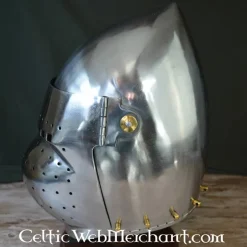 Deze sallet is gebaseerd op 16de eeuwse originelen. Dat de sallet populair was, blijkt uit dat dit type helm voor meer dan 100 jaar in gebruik is geweest! Vaak werden dit soort helmen in massa geproduceerd. Waarbij vaak in korte tijd veel van deze helmen moesten worden gemaakt. De nekbeschermer bood de drager een geweldige bescherming tegen projectielen van bovenaf. Het vizier bood een goed gezichtsveld, in combinatie met een optimale bescherming aan het gezicht. Dit lagere model sallet werd zowel door infanterie, als door cavalerie gedragen. De gepatineerd afwerking zorgt voor een extra authentiek effect. Deze helm is 1 mm dik en geschikt voor LARP battles, kostuums en Cosplay.
