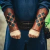 Deze armbeschermer voor de rechterarm is gemaakt van een hoge kwaliteit natuurlijk gekleurd leer en beschermt bijna de gehele arm, van de hand tot boven de elleboog. Alle onderdelen van de armbeschermer zijn aan elkaar bevestigd met leren veters, hierdoor heeft je arm een optimale bewegingsvrijheid. De onderdelen hebben allen een uniek ontwerp. Het stuk dat de hand beschermt, is gedecoreerd met ‘klauwen’ gemaakt van leer. De bovenkant heeft een prachtig semi-runen design. Je kunt de armbeschermer vastmaken rond je ellebogen, onderarm en pols met stevige leren riempjes en rond de hand met een zachte leren veter. Ook gaat er een lus rond de middelvinger zodat het leren pantser extra goed blijft zitten. Een prachtig accessoire voor duistere personages, zo ga je volledig beschermd en in stijl de strijd in!