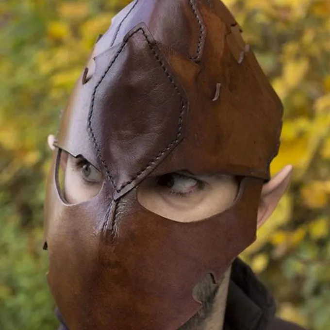 Het ontwerp van deze leren helm is gebaseerd op het reliëf van de huid van een draak en biedt een goede bescherming tijdens LARP gevechten. Met deze leren helm wordt het gehele gezicht en het hoofd beschermd. Hij is op maat verstelbaar door middel van een leren band en heeft een grote opening voor de ogen waardoor de strijd overzichtelijk blijft voor de drager. Het leer is hoge kwaliteit natuurlijk gekleurd leer.