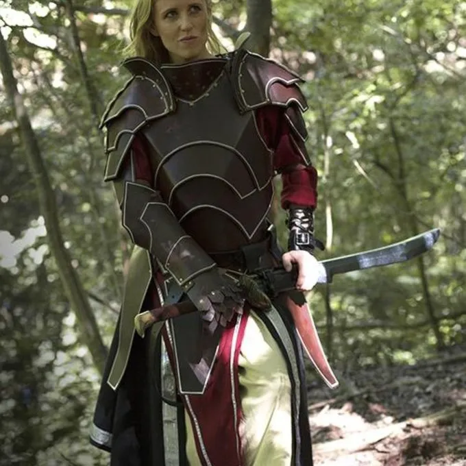 Deze set bevat alle leren pantserstukken in Dark Elf stijl. Deze leren onderdelen zijn ontworpen om samen te dragen, dus zijn volledig compatibel. De set bestaat uit: 1 leren kuras, 1 paar leren schouderstukken, 1 leren armstuk voor de rechterarm en 1 rood met grijze tuniek van 78% wolmix die speciaal is ontworpen om onder het leren pantser te dragen. Alle leren onderdelen zijn gemaakt van duurzaam natuurlijk geverfd leer en bestaan uit overlappende stukken waardoor een optimale bewegingsvrijheid ontstaat. Het leer is gedecoreerd in Dark Elf stijl met witte randen en messingen beslag.