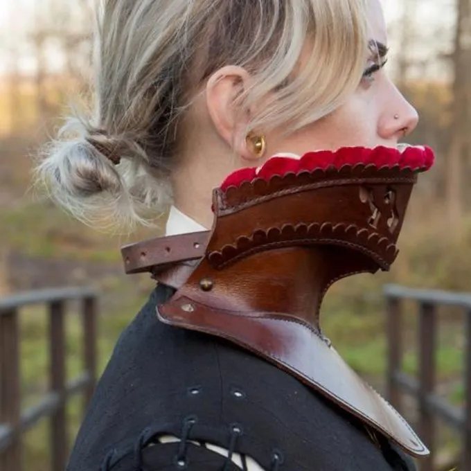 Deze leren bevor is gebaseerd op middeleeuws plaatpantser. Deze bevor is gemaakt van stevig natuurlijk gekleurd leer en beschermt het gezicht, nek en de schouders. Het leer heeft gaten bij de mond zodat het de spraak en ademhaling niet belemmert. Ook heeft hij aan de achterkant een prachtige decoratieve rand en is afgezet met fluweel. Hierdoor heeft hij een luxe en nobel uiterlijk. Je kan de bevor vastmaken met de leren riem aan de achterkant van de nek, je kunt hem verstellen op maat. Een perfect accessoire voor LARPers in middeleeuwse stijl.