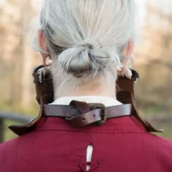 Deze leren bevor is gebaseerd op middeleeuws plaatpantser. Deze bevor is gemaakt van stevig natuurlijk gekleurd leer en beschermt het gezicht, nek en de schouders. Het leer heeft gaten bij de mond zodat het de spraak en ademhaling niet belemmert. Ook heeft hij aan de achterkant een prachtige decoratieve rand en is afgezet met zwart fluweel. Hierdoor heeft hij een luxe en nobel uiterlijk. Je kan de bevor vastmaken met de leren riem aan de achterkant van de nek, je kunt hem verstellen op maat. Een perfect accessoire voor LARPers in middeleeuwse stijl.