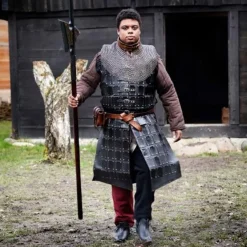 Dit LARP pantser is gemaakt van een hoge kwaliteit natuurlijk geverfd leer en is gedecoreerd met messingen nagels, in de stijl van de historische brigandine. Het pantser is geïnspireerd op de leren uitrusting van soldaten uit de veertiende tot de zestiende eeuw. Dit pantser is geschikt voor historische LARP, re-enactment, maar kan ook voor Game of Thrones Cosplay en vele andere LARP en Cosplay settings worden gedragen. Deze lange brigandine is vrij licht in gewicht en duurzaam. Hij beschermt de torso, rug, bovenbenen en knieën. De brigandine bestaat uit een leren pantser voorzien van vierkante leren plaatjes. Je kan de brigandine vastmaken met de leren riemen en koorden.