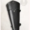 Dit leren halfmasker reikt van de neus tot de kin. Bij de mond heeft hij vier spleten zodat je goed kan blijven ademhalen en zodat het niet te heet wordt onder het masker. Je kan hem achter het hoofd vastmaken met leren banden.