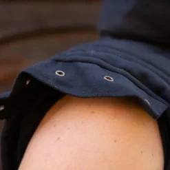 Deze gambeson biedt bescherming aan de torso en heupen. De wambuis is mouwloos en dus lekker luchtig tijdens warme dagen. Je kan hem dragen onder een maliënkolder, onder pantser of als los kledingstuk of jas. De wambuis bestaat uit lagen katoencanvas met polyester padding, in verticale lijnen genaaid in de Europese middeleeuwse stijl. De wambuis heeft een omhoogstaande kraag. Je kan hem dragen in combinatie met een wambuiskraag en kap voor een optimalere bescherming aan het hoofd en de nek. Deze wambuis is ook verkrijgbaar in grotere maten.