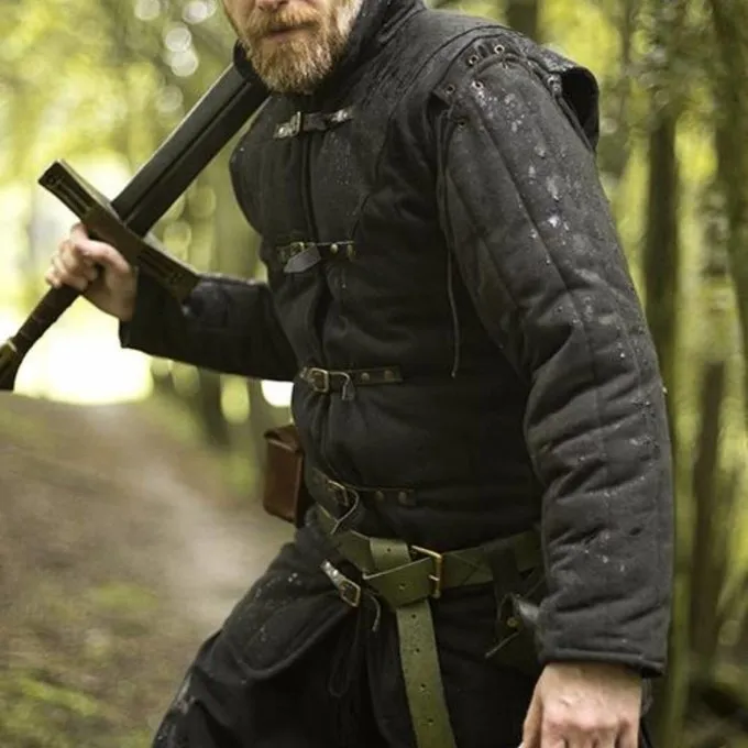 Deze wambuis biedt bescherming aan de torso en armen. De wambuis heeft verwijderbare mouwen en je kan hem dichtmaken met leren riemen. Hij komt ongeveer tot op de heupen. De wambuis bestaat uit lagen katoencanvas met polyester padding, in verticale lijnen genaaid in de Europese middeleeuwse stijl. De wambuis heeft een omhoogstaande kraag. Je kan hem dragen in combinatie met een wambuiskraag en kap voor een optimalere bescherming aan het hoofd en de nek. Deze wambuis is ook verkrijgbaar in grotere maten.