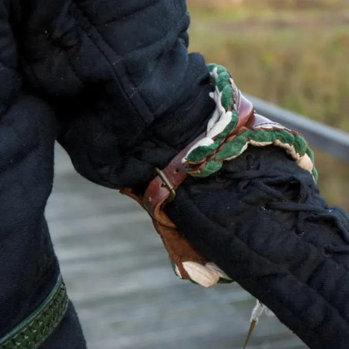 Dit prachtig leren pantser beschermt de ellebogen tijdens battles. De elleboogbeschermers worden geleverd per paar en hebben een prachtig design, met sterk bruin leer dat aan de zijkanten decoratief is uitgesneden. De beschermers hebben een prachtige groene fluwelen rand. Met een stevige leren riem kan je de elleboogbeschermers vastmaken on de binnenkant van je elleboog. Aan de buitenkant van de beschermers zitten oogjes om veters doorheen te halen, hiermee kan je ze nog steviger vastzetten op een wambuis of doublet.