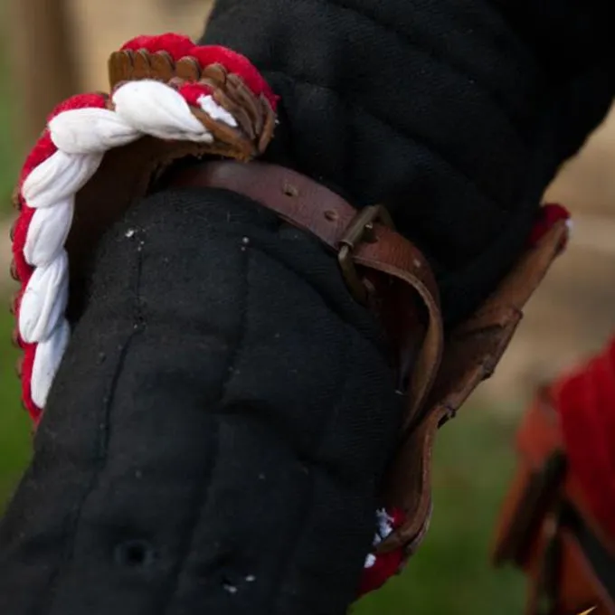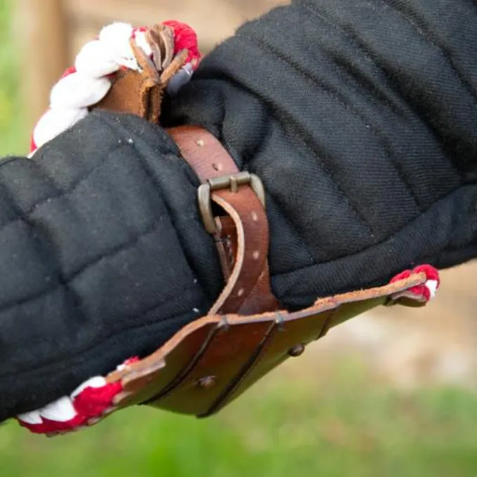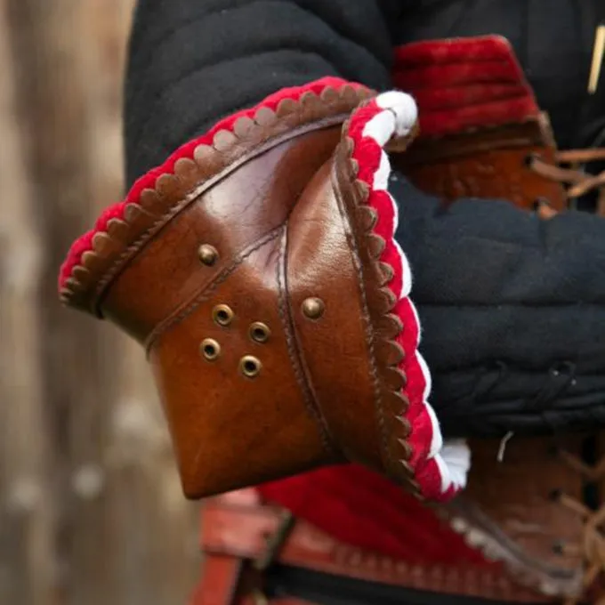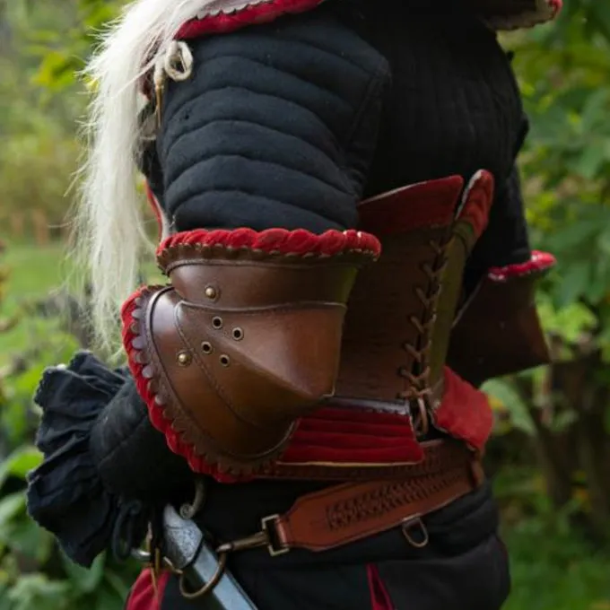 Dit prachtig leren pantser beschermt de ellebogen tijdens battles. De elleboogbeschermers worden geleverd per paar en hebben een prachtig design, met sterk bruin leer dat aan de zijkanten decoratief is uitgesneden. De beschermers hebben een prachtige rode fluwelen rand. Met een stevige leren riem kan je de elleboogbeschermers vastmaken on de binnenkant van je elleboog. Aan de buitenkant van de beschermers zitten oogjes om veters doorheen te halen, hiermee kan je ze nog steviger vastzetten op een wambuis of doublet.