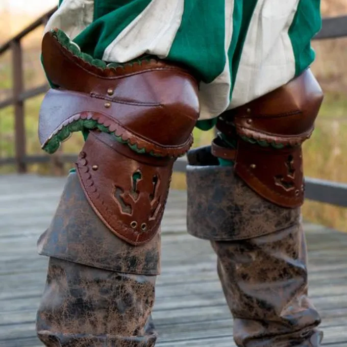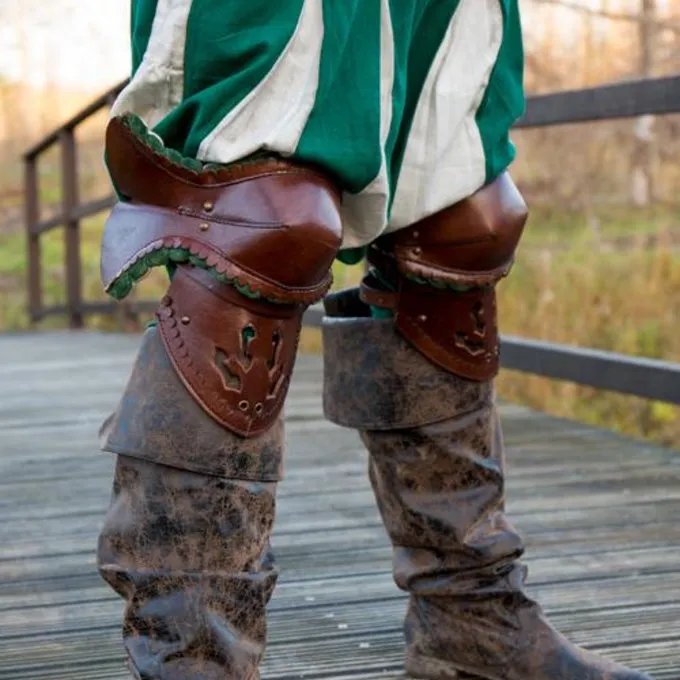 Dit prachtig leren pantser beschermt de knieën en de been net boven en onder de knie tijdens battles. Een geweldige aanvulling op je re-enactment of LARP battle gear. De kniebeschermers worden geleverd per paar en zijn gemaakt van sterk bruin leer. De onderzijde heeft een heel mooi gestempeld decoratief patroon over de rand en aan de bovenkant is het leer aan de randen in een golvend patroon gesneden. De beschermers hebben een prachtige fluwelen rand en zijn beslagen met messingen nagels. Met de stevige leren riemen kan je de kniebeschermers vastmaken om je knieholte en onderbeen. Aan de buitenkant van de beschermers zitten oogjes om veters doorheen te halen, hiermee kan je ze nog steviger vastzetten op een wambuis, doublet of ander leren pantser.