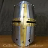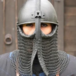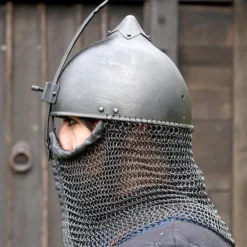 Deze helm is gebaseerd op historisch Aziatisch pantser en is geweldig voor LARP of Cosplay van oosterse verhalen, zoals Aladdin. De helm is volledig functioneel en biedt een uitstekende bescherming van het hoofd in LARP battles. De lange neusbeschermer aan de voorkant geeft de helm een exotisch uiterlijk en biedt tegelijkertijd een goed gezichtsveld en beschermt het gezicht. De neusbeschermer kan ook eraf worden gehaald, als je de helm met een andere twist wilt dragen. De helm heeft een brede opening voor de ogen en een nekbeschermer van ongeklonken gebronsde maliënringen. De randen van de maliën nekbeschermer zijn voorzien van een leren rand bij het gezicht. Dit ziet er prachtig uit, maar zorgt er ook voor dat het maliën niet langs je gezicht schuurt. Je kan de helm stevig vastmaken met een leren riempje onder de kin. De helm wordt geleverd inclusief een witte tulband, deze kan je vastmaken aan de helm door middel van vier gaten in het staal aan de achterkant.