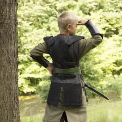 Dit leren borstpantser is gemaakt van natuurlijk gekleurd leer. Hij is geschikt voor kinderen en kleiner gebouwde mensen met een torso lengte van ca. 48 cm en een borstomtrek van 66 cm t/m 82 cm. Het pantser heeft een fijne prijs en is een mooie basis voor een leren LARP outfit van een jager of krijger. Het pantser heeft handgestikte details met een leren veter en heeft leren riemen aan de zijkant om hem in maat te verstellen.