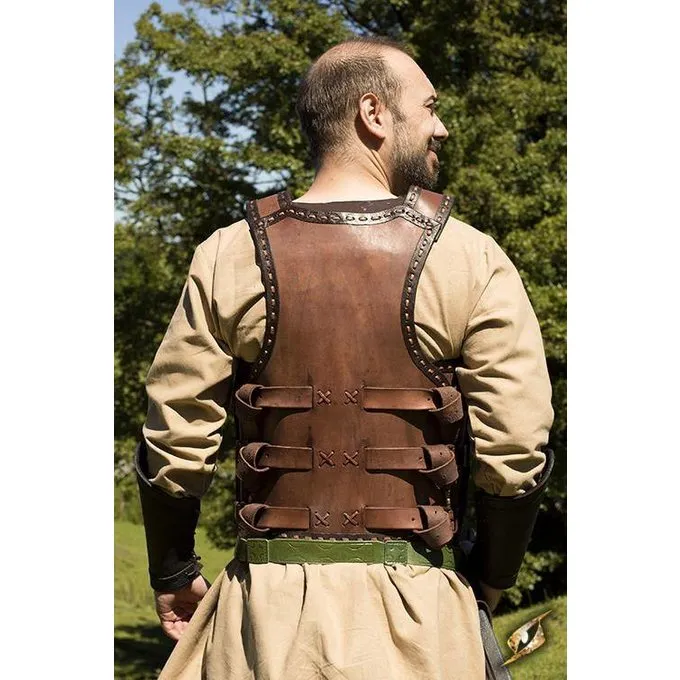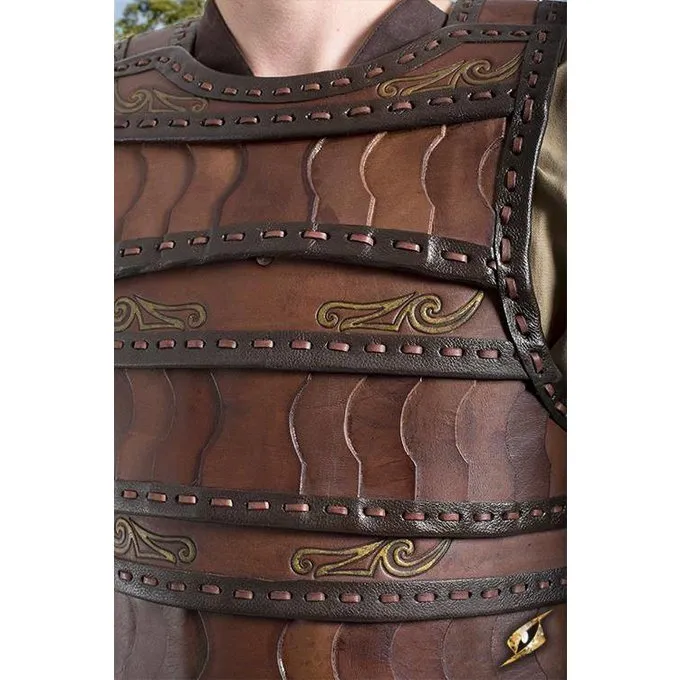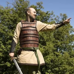 Heel mooi, bruin leren, lamellen pantser. Het pantser is gebaseerd uit pantser dat in de oudheid en door vikingen werd gedragen. Het is afgewerkt met bronzen versieringen, decoratieve stiksels en zomen. Door middel van riemen en gespen helemaal op de gewenste maat in te stellen. Geschikt voor zowel LARP gevechten als middeleeuws re-enactment. Het pantser is verkrijgbaar in de maten S/M en L/XL. De lengte bij S/M is ca. 63 cm, de breedte is ca. 47 cm en de borstomtrek is ca. 92 cm, Hij weegt ca. 2100 gram Bij L/XL resp. 69 cm, 50 cm en 102 cm, Hij weegt 2400 gram