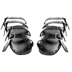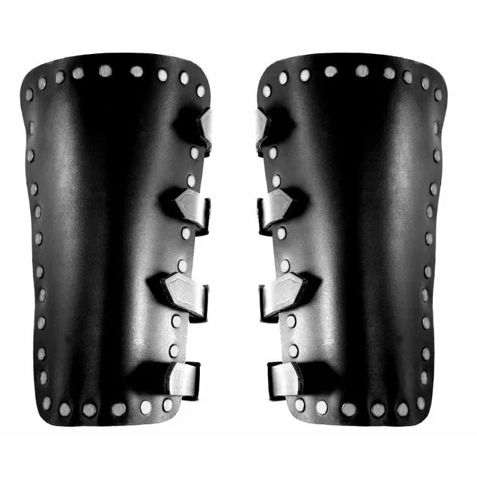 Dit paar onderarmbeschermers is gemaakt van zwart leer. Ze zijn genageld met messingen nagels. De onderarmbeschermers zijn 23 cm hoog en 17 cm breed. Ze kunnen met leren riempjes op maat gesteld worden.