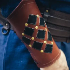 Dit paar onderarmbeschermers is gemaakt van bruin leer. Ze zijn gedecoreerd met ruiten van zwart leer. De onderarmbeschermers zijn 25 cm hoog en 24 cm breed. Ze kunnen met leren veters op maat gesteld worden.