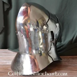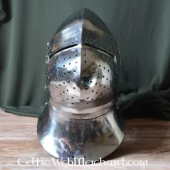 Deze helm is gebaseerd op een bascinetmodel van de eerste helft van de 15de eeuw. Hij heeft een 2 mm dikke helmkom en het vizier en andere helmdelen zijn 1,6 mm dik. Hij heeft een leren riem voor onder de kin en een textielen inleg. Geschikt voor een hoofdomtrek van max. 64 cm.