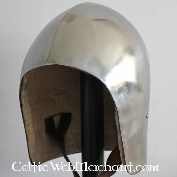 Deze bascinet is een replica van een exemplaar uit de 2de helft van de 14de eeuw. De helm biedt een veel beter gezichtsveld dan de gesloten helm en is daarnaast comfortabeler om langere tijd te dragen. Helmen zoals deze werden in een grote diversiteit in geheel Europa gedragen. Dit exemplaar is gemaakt naar een origineel teruggevonden in Spanje. Hij is geschikt voor een hoofdomtrek van 63-64 cm.
