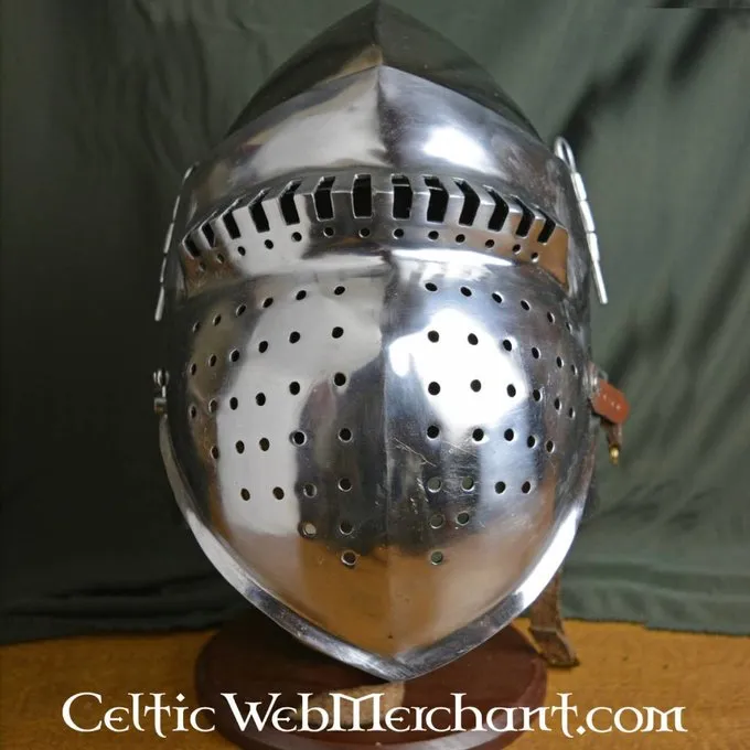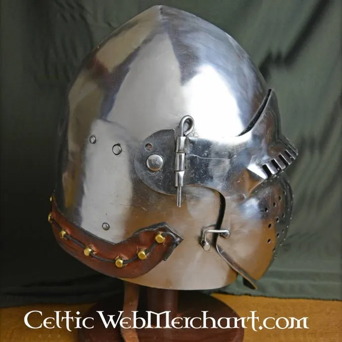 Deze bascinet is gebaseerd op de helmen die de 14de en 15de eeuwse man-at-arms droegen. Deze zware infanterie was gepantserd met het oog op frontale impacten. Deze helm is gemaakt van 2,5 mm dik, ongetemperd koolstofstaal. Deze helm is niet voorzien van een inleg zodat zelf de gewenste inleg kan worden gekozen.