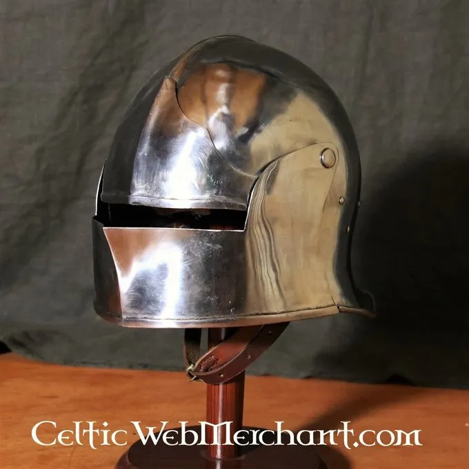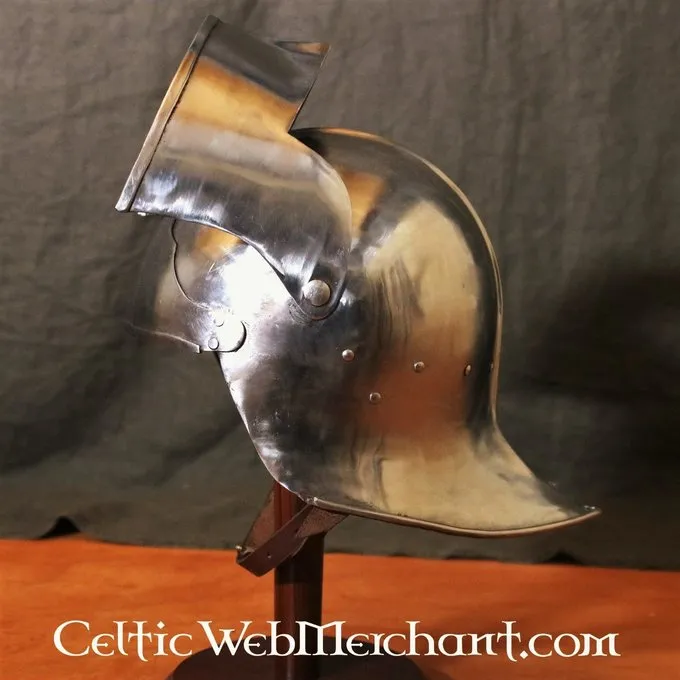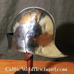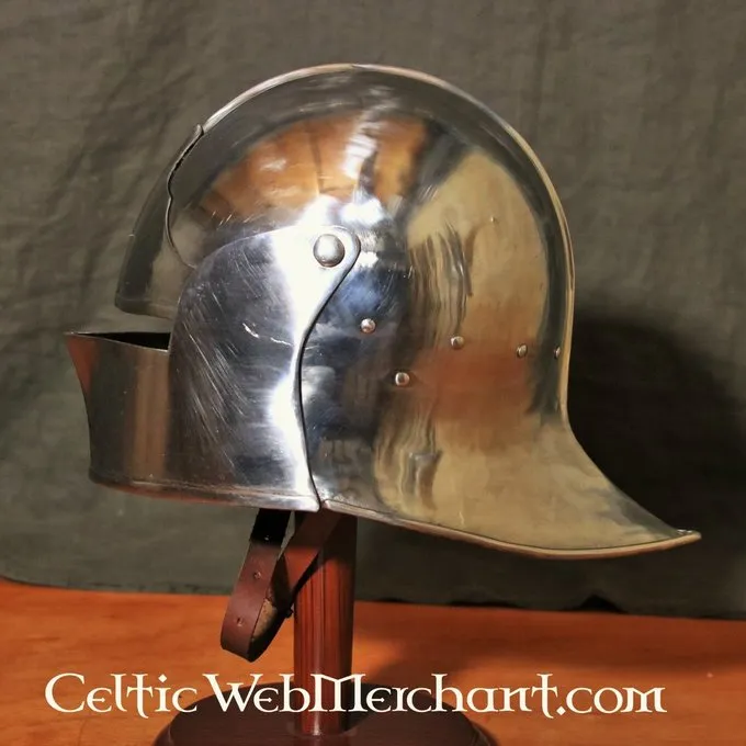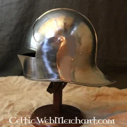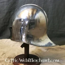 Deze sallet is gemaakt van 1,6 mm dik staal. Hij heeft een textielen inleg en een riem om hem onder de kin vast te zetten. Hij is verkrijgbaar in maat L (omtrek 63-64 cm).