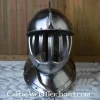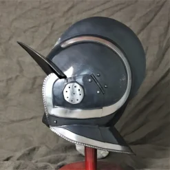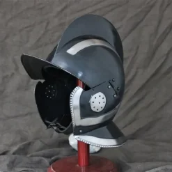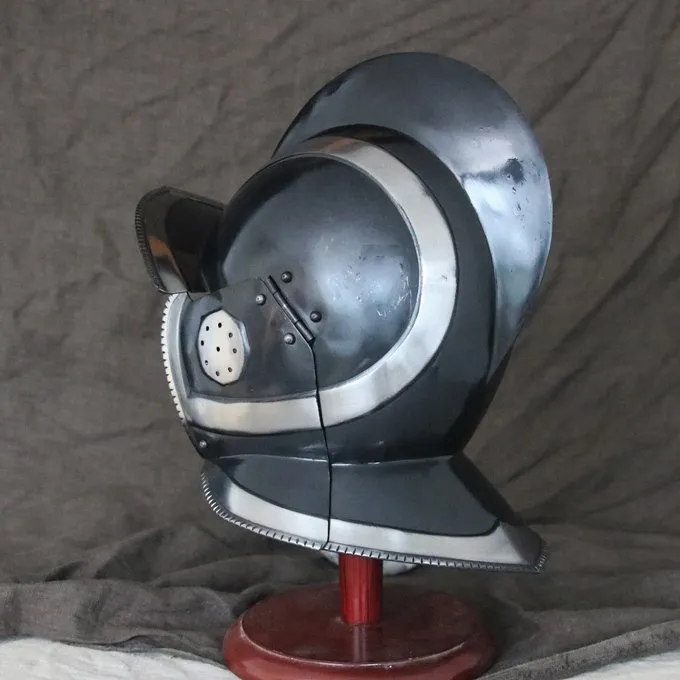 Deze prachtige burgonet is een replica van de vele 17de eeuwse cavaleriehelmen die tegenwoordig in musea liggen. Deze helmen werden door cavaleristen gedragen die rond die tijd vaak gewapend met degen en radslotpistolen de vijand tegemoet reden. Of, er hard voor wegreden. Als cavalerist kan dat! Deze burgonet is voorzien van wangkleppen die gehoorgaatjes bevatten. Hij heeft een nek en wenkbrauwbeschermer voor bescherming tegen neerkomende projectielen.