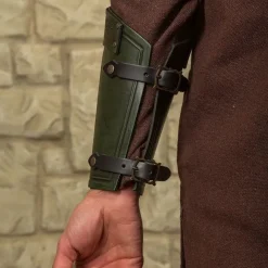 Deze armbeschermers zijn geschikt voor reenactment, cosplay en LARP. Ze zijn gemaakt van leer. De armbeschermers zijn zo gedecoreerd aan de bovenkant, zodat het lijkt of ze een hamerslag afwerking hebben. Het onderste deel is bedrukt met een decoratief patroon. De armbeschermers kunnen gesloten worden met de twee riemgespen aan de achterzijde.