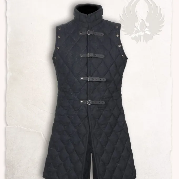 Deze mouwloze gambeson is ideaal voor het neerzetten van een LARP en reenactment karakter. De gambeson is aan de voorkant voorzien van leren riempjes die met gespen worden gesloten. De buitenkant van deze gambeson is gemaakt van ruw geweven katoen canvas. Hij heeft een padding van polyester. Bij de armen is deze gambeson voorzien van vetergaten waaraan bijbehorende armstukken of harnas onderdelen kunnen worden bevestigd.