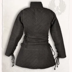 Een prachtige gambeson voor reenactment en LARP. De gambeson Diana heeft veters aan de mouwen en aan de zijkanten. Hierdoor kan hij op maat van de lichaamsomtrekken van de drager worden aangepast. Hierdoor is de gambeson Diana een zeer comfortabele gambeson die optimale bewegingsvrijheid biedt. Natuurlijk kan deze gambeson zowel door mannen als vrouwen worden gedragen. De veters en sluitingen zijn allemaal van leer gemaakt om hem historisch geschikt te maken voor 15de eeuwse reenactment. De buitenkant van deze gambeson is gemaakt van ruw geweven canvas. De padding is gemaakt van wolvilt.