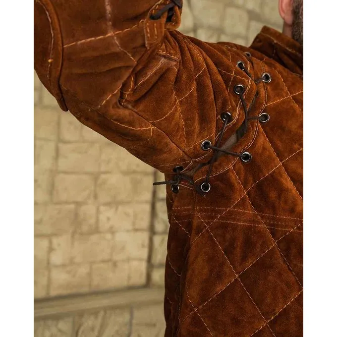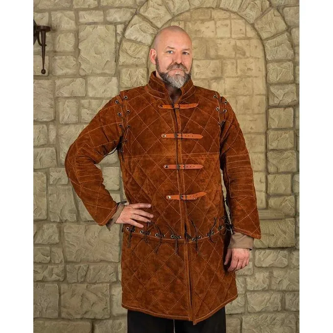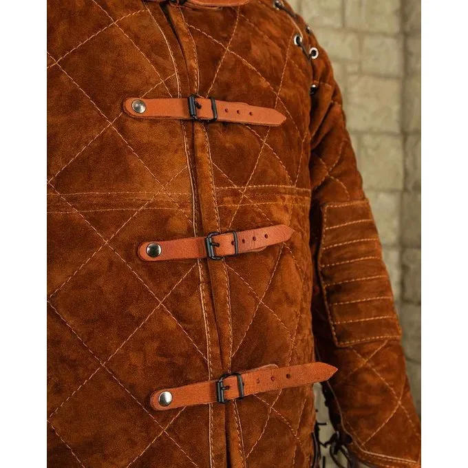 Dit product is geschikt voor reenactment, cosplay en LARP. De gambeson is gemaakt van suède, katoen en polyester. De gambeson heeft aan de voorzijde vier riemgespen. Er zitten oogjes om de mouwen en tassets te bevestigen door middel van touwtjes. De vulling zorgt ervoor dat er veel bewegingsvrijheid is zonder dat de gambeson, daardoor zijn beschermende eigenschap verliest.