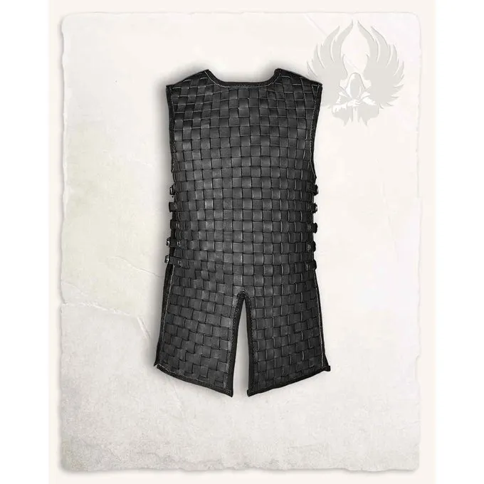 Dit pantser is geschikt voor reenactment, cosplay en LARP. Dit product is gemaakt van bovenleer. Het pantser is gemaakt van gevlochten leren strips. Aan beide zijden van het pantser bevinden zich vijf riemgespen. Deze zorgen ervoor dat de pasvorm optimaal kan gemaakt kan worden aan de pasvorm van zijn drager. Doordat het pantser een snede aan zowel de achter- als voorzijde een snede heeft, krijgt de drager extra bewegingsvrijheid. Het design zelf van dit pantser geeft de drager een authentieke en robuuste uitstraling.