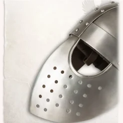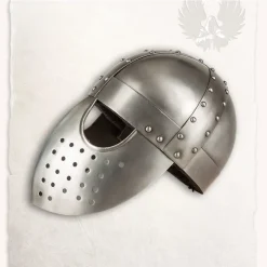 Deze Middeleeuwse helm is gebaseerd op historische originelen die ridders droegen tijdens de Eerste Kruistocht. Middeleeuwse helmen zoals deze worden regelmatig op monumenten zoals in kerken afgebeeld. Hij bood meer bescherming aan het gezicht dan de neushelm. Geweldig voor middeleeuwse kostuums en LARP.