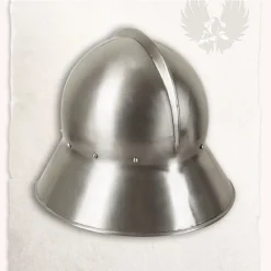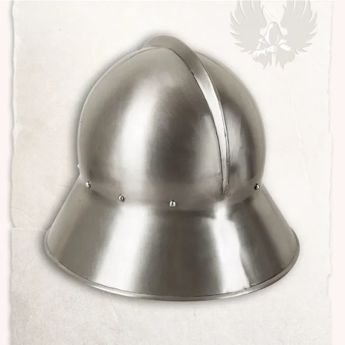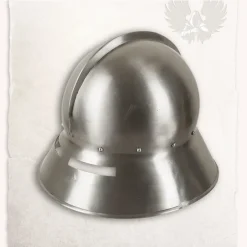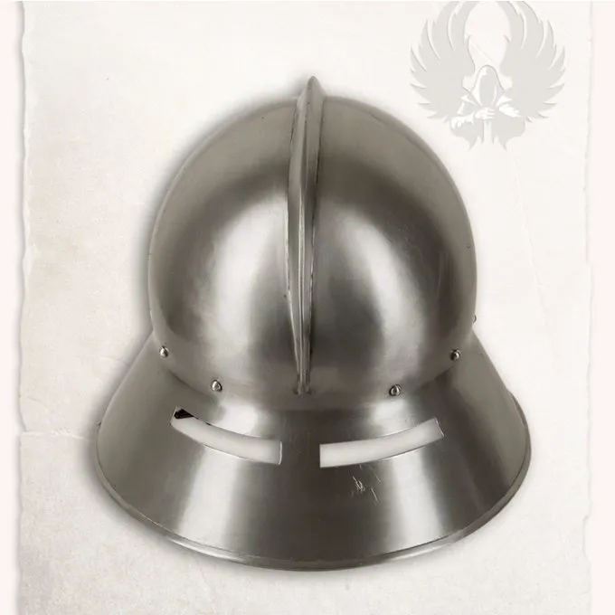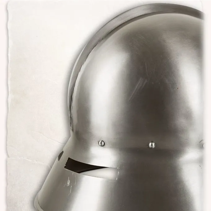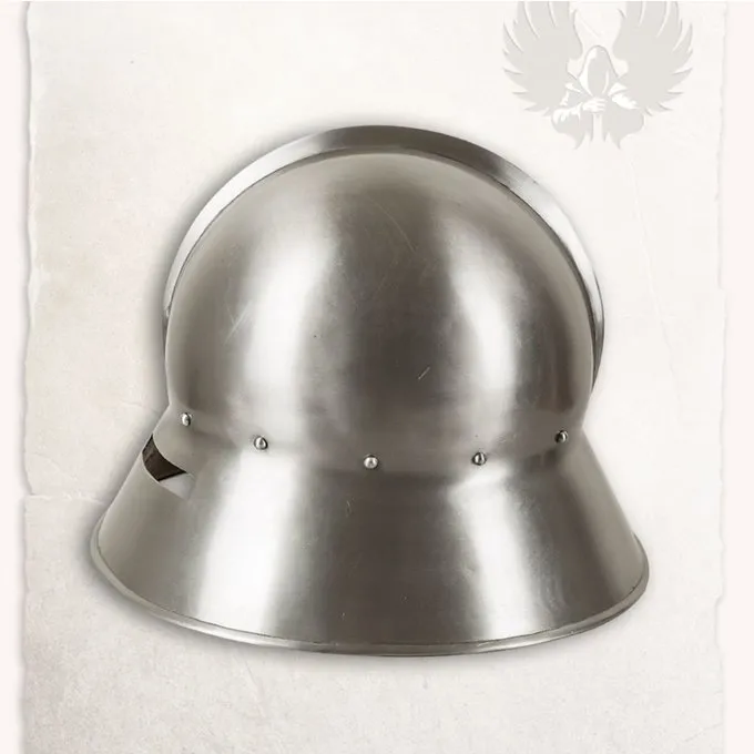 Middeleeuwse helmen zoals deze waren zeer populair bij Middeleeuws voetvolk. De ketelhoed bood dankzij de overstaande rand niet alleen bescherming aan het hoofd, maar aan het gehele lichaam. Deze unieke ketelhoed is gebaseerd op 15de eeuwse originelen die ook door kruisboogschutters zijn gedragen, te zien in manuscripten en andere middeleeuwse visuele bronnen. Hij biedt bescherming aan het gezicht en is voorzien van vizier.