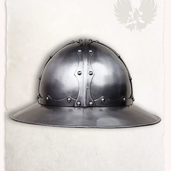 Deze Middeleeuwse ketelhoed is gebaseerd op afbeeldingen in de Maciejowski bible. Middeleeuwse helmen zoals deze waren ideaal omdat de rand bescherming bood tegen binnenkomende pijlen en projectielen. Ketelhoeden werden door alle standen van de bevolking gedragen.