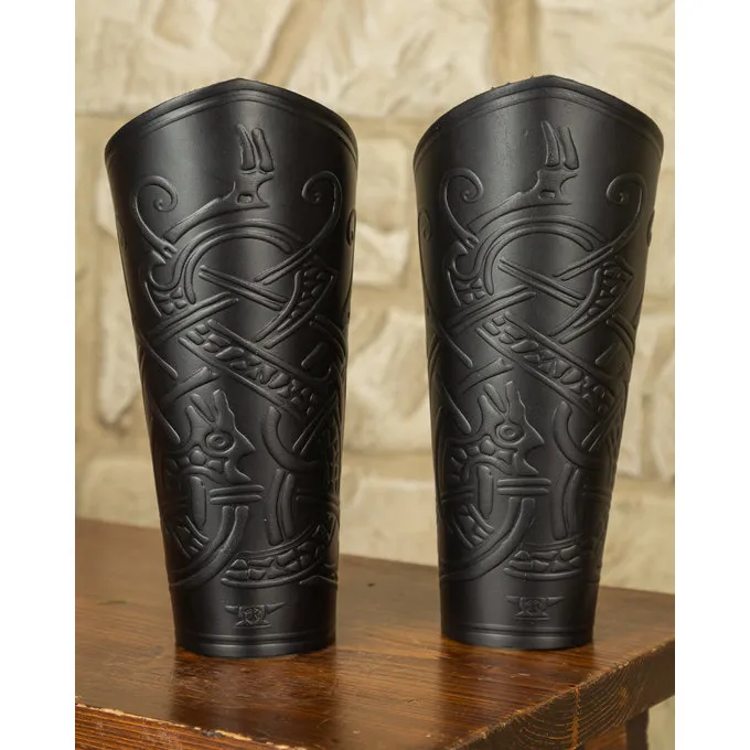 De armbeschermers zijn geschikt voor reenactment, cosplay en LARP. Dit product is gemaakt van hoge kwaliteit leer. De armbeschermers zijn versierd met afbeeldingen van de bekende Midgard slang. De armbeschermers kunnen gesloten worden met een vetersluiting.