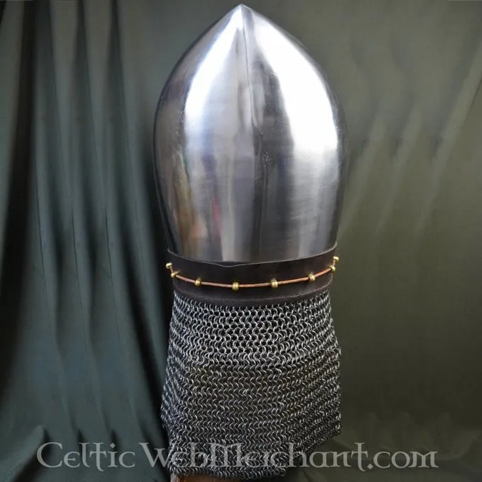 Deze bascinet is gebaseerd op originelen die rond het eind van de 14de en begin van de 15de eeuw werden gedragen. In tegenstelling tot zijn voorgangers wijst de punt (bovenkant) van dit type bascinet licht naar achteren toe. Deze bascinet is voorzien van een maliënkraag. Het maliën is gemaakt van verenstaal ronde ringen geknepen en is gewoven in de 1 op 4 constructie. De helm is beschikbaar in maat M en L en is voorzien van een textielen inleg. Deze helm is ontwikkeld met het oog op re-enactmentgevechten.