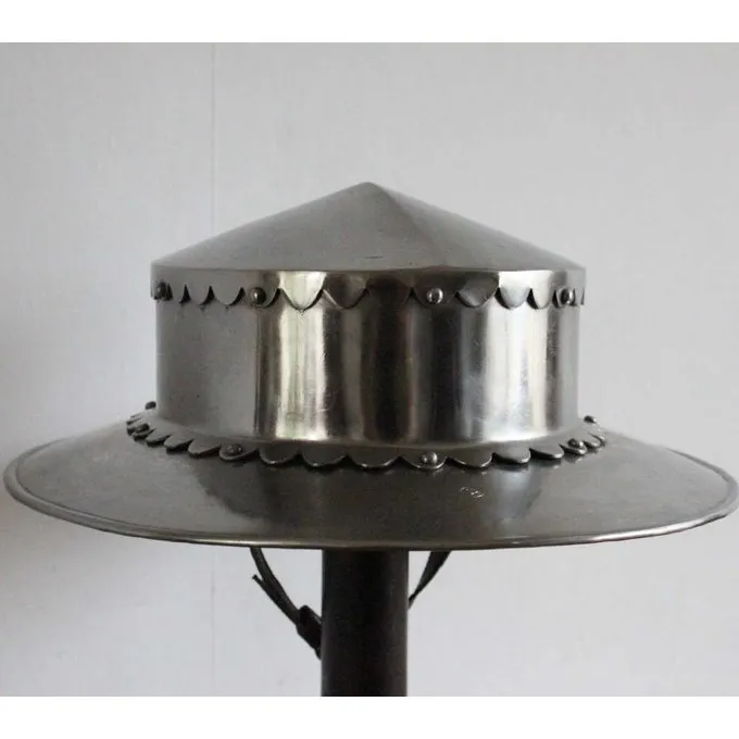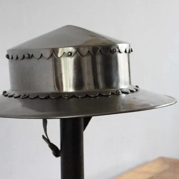 Deze helm is met de hand gemaakt van 2 mm dik staal. Hij heeft een leren inleg en een kinriem met authentieke gesp. Hij is verkrijgbaar in 3 maten. Maat S is geschikt voor een maximale hoofdomtrek van 58 cm, Maat M is geschikt voor een maximale hoofdomtrek van 62 cm, maat L voor een maximale hoofdomtrek van 65 cm.