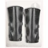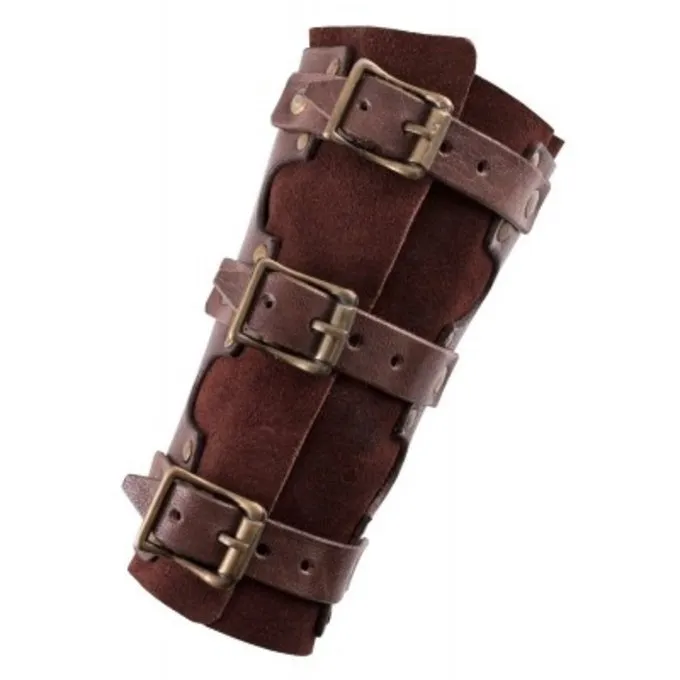 Dit paar armbeschermers is gemaakt van sterk natuurlijk gelooid leer en zacht suède. Rustieke klinknagels verbinden de twee leerlagen. Het oppervlak en de randen van het dikke leer zijn gepolijst en hebben een lichte kleurafwerking, wat het leer zijn karakteristieke vintage look geeft. De armbeschermers kunnen worden gesloten met drie gespen en zijn op maat verstelbaar.