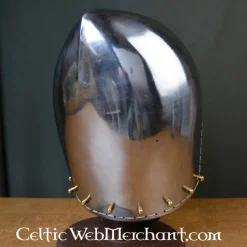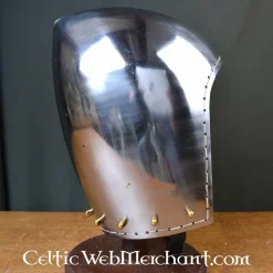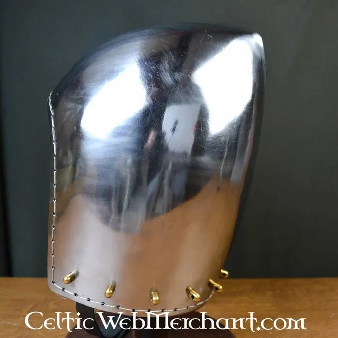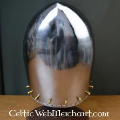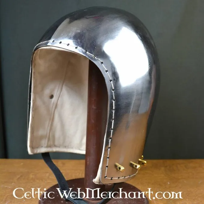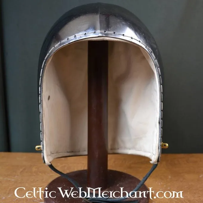 Deze degelijke bascinet is een replica van een 14de eeuws origineel. Dit geliefde type helm werd tussen de 14de en 15de eeuw overal in Europa gedragen. De helm is gemaakt van 2 mm dik staal en is voorzien van een textielen inleg. De onderrand is voorzien met ophangpunten om een maliënkraag aan te bevestigen. Deze helm is volledig battle-ready.