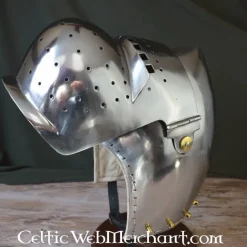 Deze bascinet is gebaseerd op vroeg 15de-laat 14de eeuwse originelen. Dit type bascinet staat bekend als een klappvizier bascinet. Exemplaren zoals deze werden overal in Europa gedragen. Het was het eerste type gesloten bascinet. De bascinet is gemaakt van 2 mm dik staal en is volledig battle-ready. Hij heeft een degelijk vizier, dat een goed gezichtsveld en ventilatie biedt. De helm is voorzien van een verstelbare leren inleg. De onderrand van deze helm is voorzien van ophangpunten, waaraan een maliënkraag kan worden bevestigd.