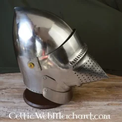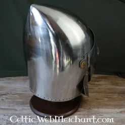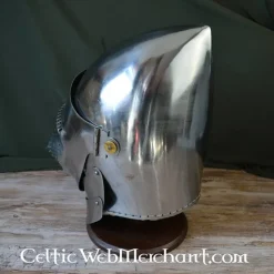 Deze middeleeuwse bascinet is een replica van een vroeg 15de-laat 14de eeuws origineel. Bascinets zoals deze werden gedurende de 15de eeuw in geheel Europa gedragen. Oorspronkelijk was deze bascinet waarschijnlijk van Italiaanse makelij. Deze luxe hondensnuitbascinet is voorzien van een beweegbare nekbeschermer. Het vizier en de helmkom lopen zeer puntig uit, om zo slagen te af te geleiden. Deze bascinet kan gemakkelijk worden voorzien van een ophanging om een maliënkraag aan te bevestigen.