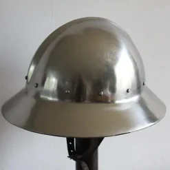 Deze gevechtsklare ketelhoed is naar een type uit ongeveer 1340. De helm is met de hand van 2 mm sterk staal gemaakt. Hij heeft een verstelbare leren inleg en een kinriem om vast te maken.